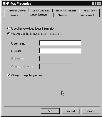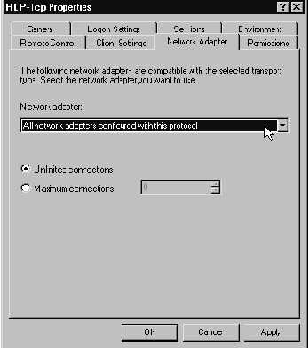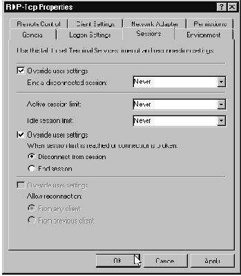 Вы можете установить период неактивности, по истечении которого производится автоматическая разрегистрация. Это особенно полезно в модемных соединениях; освободившееся соединение может использовать другой пользователь. Особо умные пользователи могут "обманывать" неактивность, просто периодически перемещая мышь. Вот почему вы можете еще установить максимальное время активности сеанса. Это предотвращает "монополизирование" пользователем соединения. На закладке Sessions также можно указать, что делать при отключении пользователя - принудительно завершить сеанс или оставить его работать. Закрытие сеансов предотвращает сервер от "забивания" работающими приложениями. С другой стороны, если оставить сеанс работающим, то пользователь может позднее снова подключиться к нему и продолжить работу. Я рекомендую завершать сеансы при отключении, но оставлять работать сеансы администраторов и отдельных важных пользователей. Администраторы часто запускают процессы, требующих много времени для свой работы. Если разрешить пользователю отключаться без закрытия саенсов, то пользователь может подключиться, запустить приложение, отключиться, пойти пообедать, потом снова вернуться, подключиться и закончить работу.